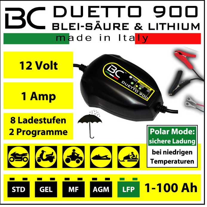 BC DUETTO ist das intelligente universale Ladegerät für beide Blei-Säure- und Lithiumbatterien, das entwickelt wurde, um ein einzelnes Mehrzweck-Gerät für alle 12V Motorradbatterien anzubieten. Das Ladegerät hat zwei verschiedene Aufladungsprogramme für Blei-Säure- und LiFePO4-Batterien. Seine maximale Ladestrom von 1,5 Ampere macht es nicht nur ideal für die Erholung, Aufladung und Erhaltung aller ATV, Roller und Motorrad-Batterien, sondern auch für die Wartung von Autobatterien.