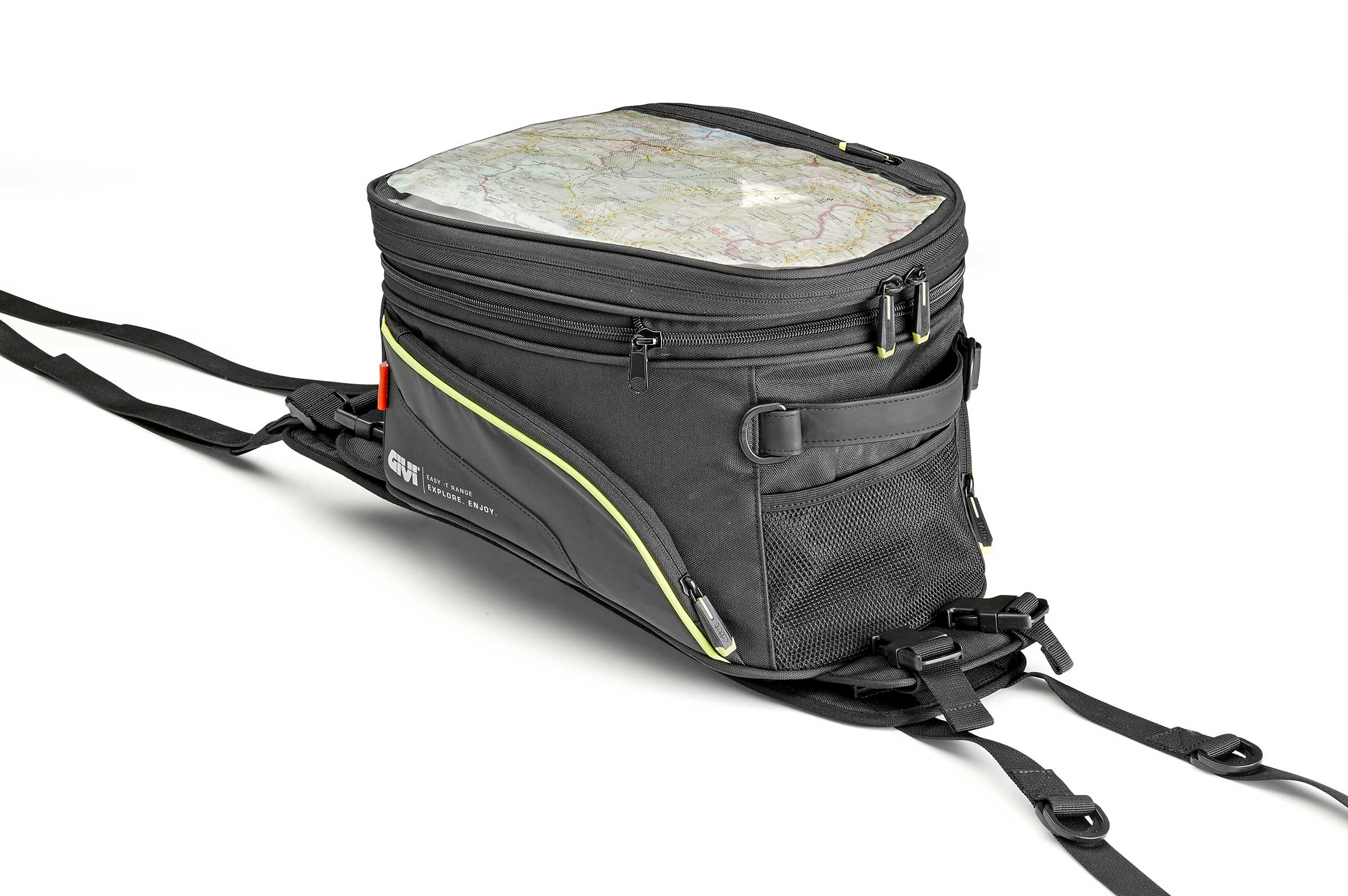 - Direkt an allen anderen Enduro Motorrädern, die einen Tank mit denselben Charakteristiken aufweisen, durch drei regulierbare Riemen mit spezifischen Befestigungen aus dem Lieferumfang.