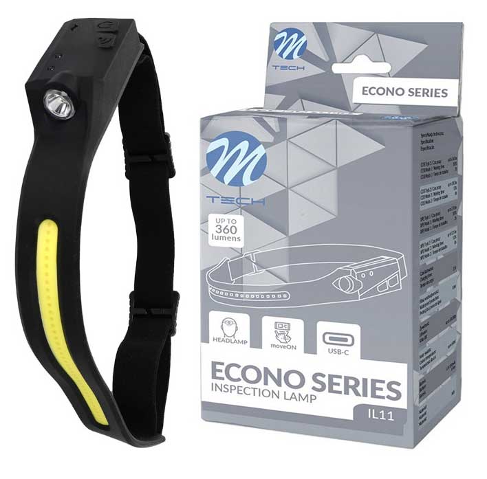 Die IL11 ist eine professionelle Inspektionslampe aus der neuesten M-TECH ECONO Lampenserie. Eine Stirnlampe in Form eines flexiblen Kopfbandes mit einer eingebauten 4W COB-LED, drei Betriebsmodi und einer zusätzlichen Seitenlampe, die mit einer 3W LED ausgestattet ist.