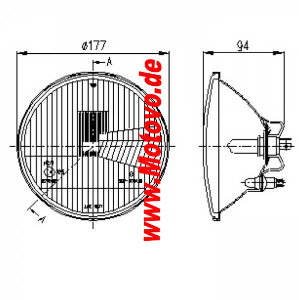 Scheinwerfereinsatz H4 Einsatz 7" Streuglas mit Standlicht Tiefe: 94 mm Einsatz: Ø 177 mm Linse: Ø 165 mm E-geprüft