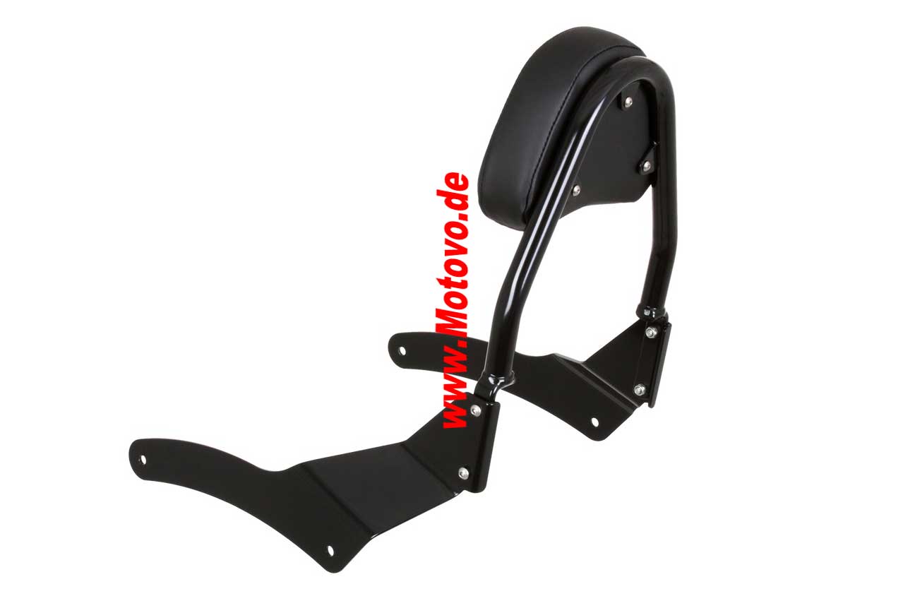 Der Hauptrahmen der Sissybar besteht aus einem 22mm Rundrohr-Gestell und ist mit einem schön ausgeführtem Kissen ausgestattet. Eine schwarz pulverbeschichtet Blende macht aus dieser Sissybar ein wahres Gadget, das nicht auf dem Motorrad fehlen sollte.