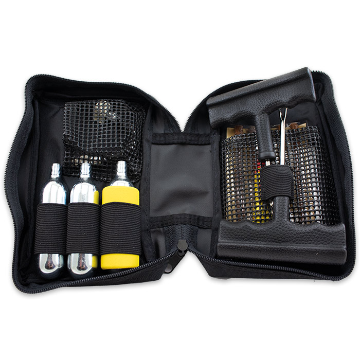 Der ideale Reisebegleiter, ersetzt in Notfällen das „Reserverad". Das Set besteht aus den nötigen Werkzeugen und Füllstoff um den Reifen zuverlässig zu dichten sowie 3 Druckluftpatronen.