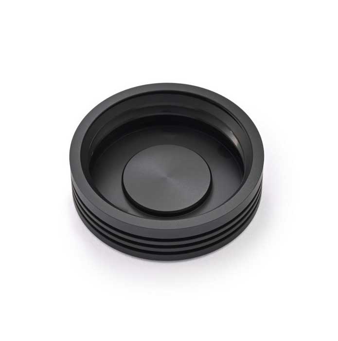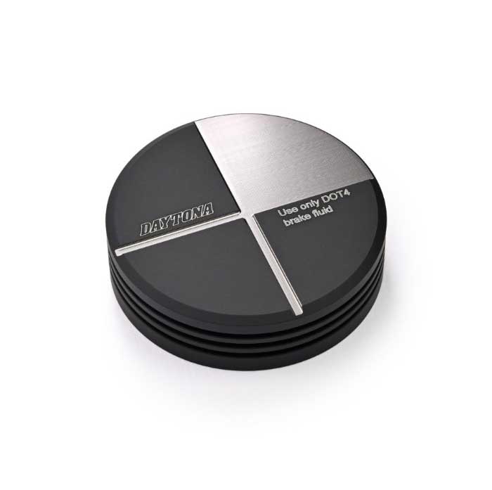 CNC-gefräster Aluminium Deckel für die hintere Bremspumpe in schwarz und gun-metal grau 2-farbig eloxiert. Die originale Membran wird weiterverwendet.